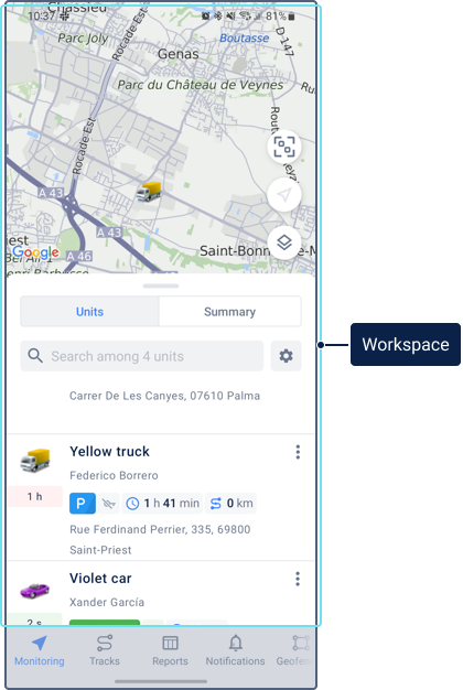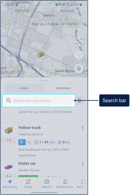 Nas abas Monitoramento, Vídeo e Cercas eletrônicas, bem como na seção Modelos da aba Relatórios, há uma busca dinâmica. Ela funciona pelo nome do item.