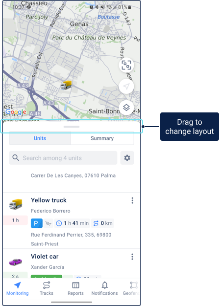 Você pode ajustar o layout da aba Monitoramento. Expanda as informações da unidade ou o mapa arrastando a seção de informações para cima ou para baixo.