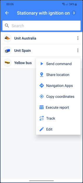 Os dados do resumo são organizados em categorias, cada uma exibindo um número de unidades correspondentes a um estado específico. Para visualizar as unidades, toque na categoria. A partir da lista de unidades, você pode acessar as informações detalhadas da unidade e o histórico ou abrir o menu da unidade.