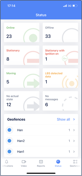 Esta aba contém informações resumidas sobre as unidades da lista de trabalho. Aqui é possível avaliar a conexão e o estado de movimentação das unidades e visualizar as cercas eletrônicas em que as unidades estão localizadas. As informações são atualizadas à medida que novas mensagens são recebidas.