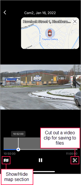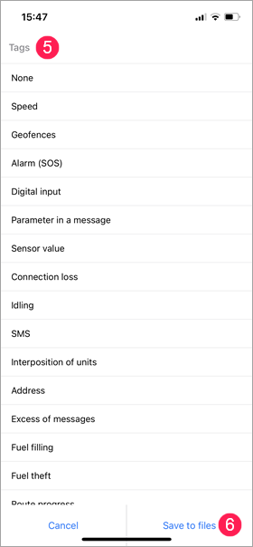É possível salvar um trecho de gravação como um arquivo que ficará disponível posteriormente na aba Arquivos. Os arquivos salvos também estão disponíveis na aba com o mesmo nome na versão web do Wialon, nas mensagens e nos relatórios.