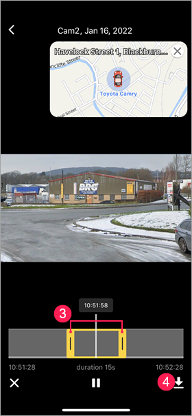 Usando os controles deslizantes à esquerda e à direita, defina a duração em segundos antes e depois do ponto selecionado. A duração mínima permitida é de 2 segundos e a máxima é de 60 segundos. A duração do trecho salvo será igual à soma dos segundos antes e depois do ponto selecionado (marcado pelo controle deslizante branco) e é exibida abaixo da linha do tempo.