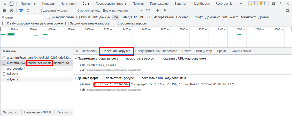 Также узнать необходимое значение параметра tzOffset можно с помощью просмотра сетевых запросов в момент изменения часового пояса пользователя в веб-интерфейсе.