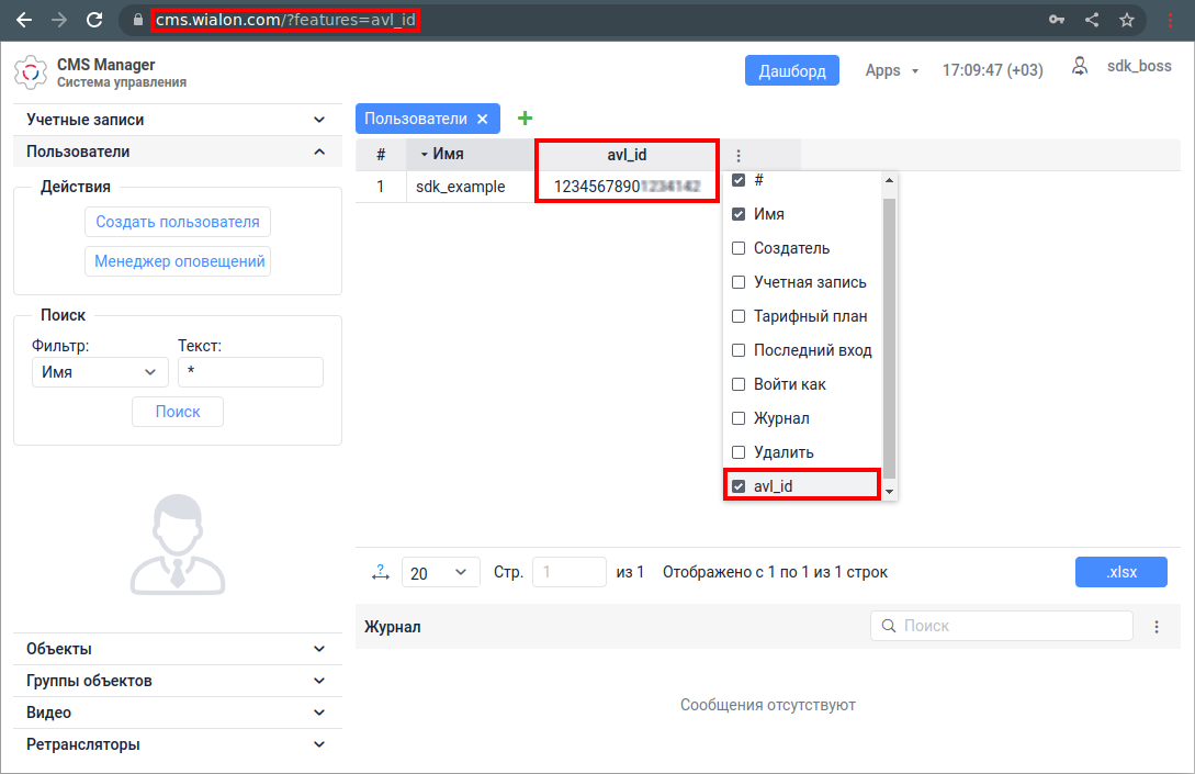 Чтобы столбец avl_id отображался, необходимо авторизоваться в CMS, добавив в конец ссылки ?features=avl_id. Пример такой ссылки приведен на изображении ниже.