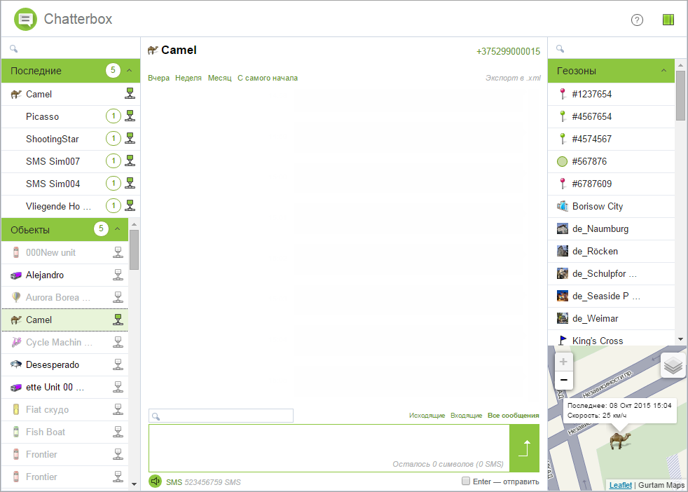 Левая панель представляет собой список доступных объектов и водителей. В верхней части этой панели показываются последние диалоги.