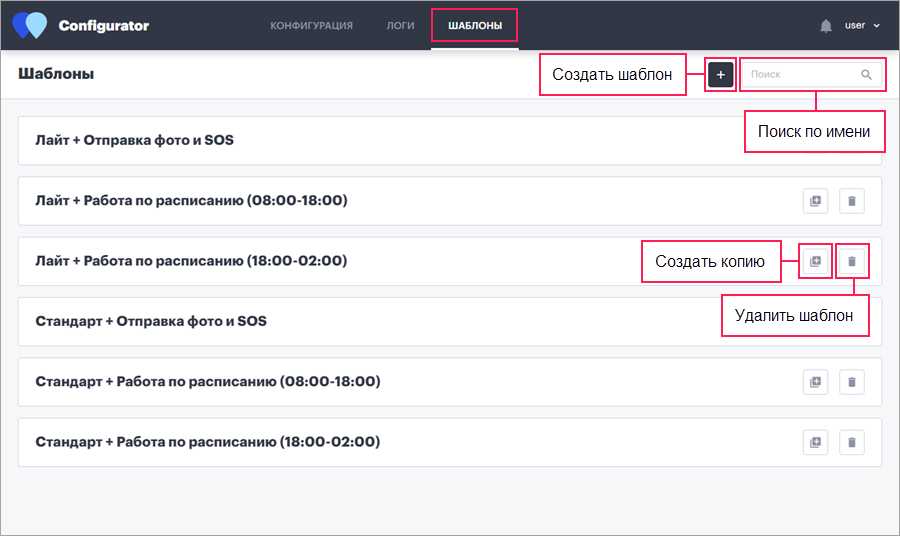 На этой странице можно создавать шаблоны конфигурации. Впоследствии эти шаблоны можно применять к устройствам объектов на странице Конфигурация. Это упрощает процесс настройки устройств, так как не приходится создавать одну и ту же конфигурацию заново.