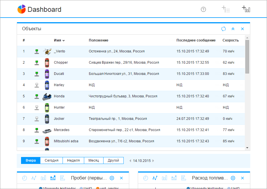 После первого входа в приложение в рабочей области показывается список объектов, график по пробегу (10 объектов с наибольшим пробегом за вчерашний день) и график по расходу топлива (10 объектов с наибольшим расходом топлива за вчерашний день).