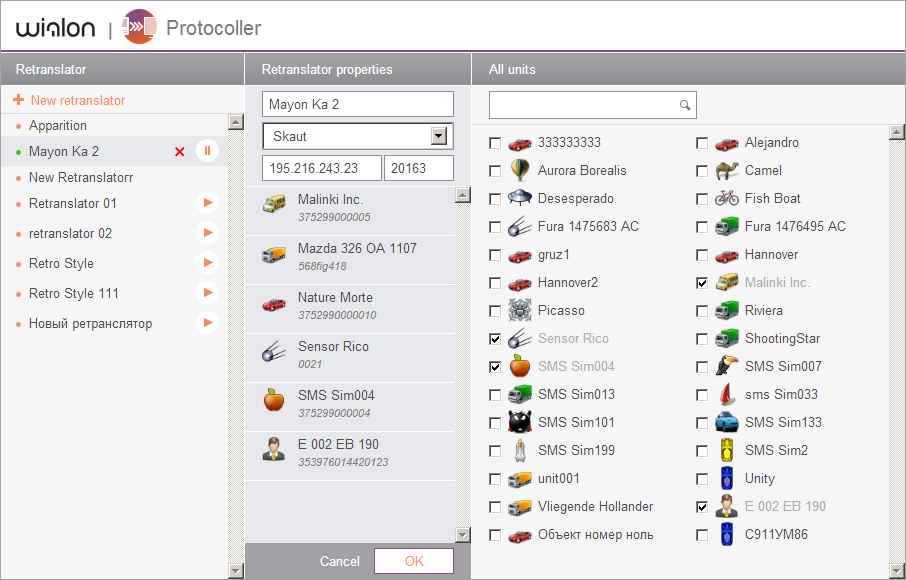 Protocoller — это приложение, которое позволяет ретранслировать сообщения от объектов с вашего сервера на другие серверы или системы. В приложении можно ретранслировать данные одновременно на несколько серверов по различным протоколам.