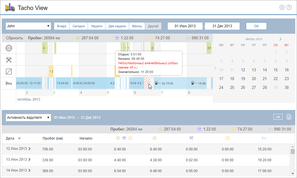 - график активности водителя,
