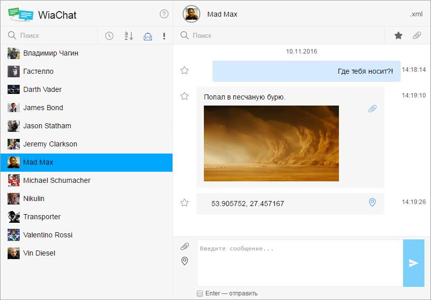В правой панели располагается чат и поле ввода сообщений. Текстовое сообщение можно дополнить файлом или местоположением (адрес или координаты). Щелкните по иконке в форме скрепки, в системном диалоге выберите необходимые файлы и нажмите ОК. Кроме того, файлы можно перетащить мышкой из папки в диалоговое окно чата. Для прикрепления местоположения щелкните по иконке в форме метки, выберите необходимое место на карте и нажмите Прикрепить.