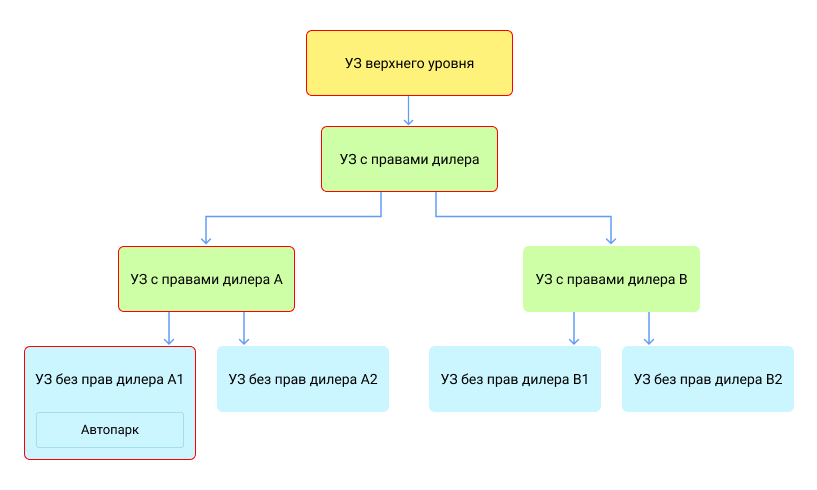 На схеме выше автопарк был активирован для учетной записи A1. Права администратора на этот автопарк получили все пользователи, учетные записи которых обведены красным цветом.
