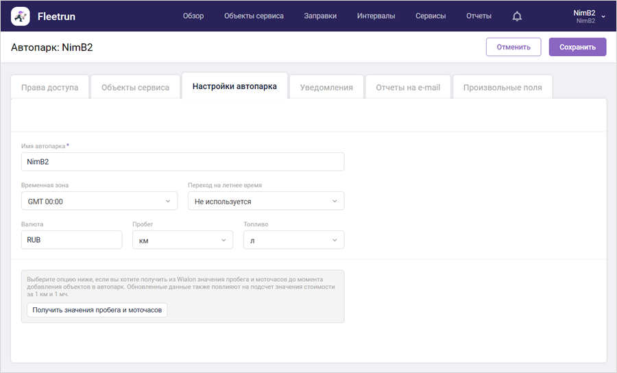 На этой вкладке указываются имя автопарка, временная зона, к которой он относится, период перехода на летнее время, единицы измерения пробега и объема топлива, используемая валюта. Здесь также можно получить из Wialon значения пробега и моточасов за период, предшествующий добавлению объектов в автопарк.