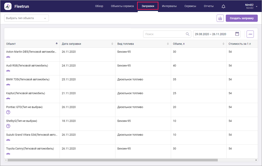 Таблицу заправок можно экспортировать в файл формата CSV, нажав на кнопку