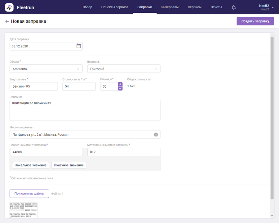 | Дата заправки | Дата выполнения заправки. В выпадающем календаре можно выбрать дату в прошлом или настоящем. Нельзя выбрать более одного дня. |