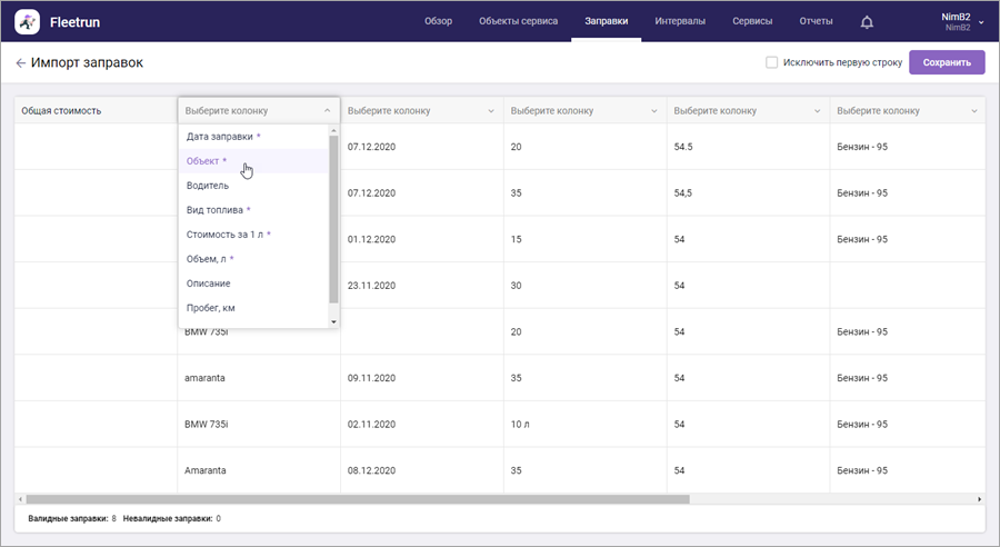 Для объектов автопарка можно импортировать заправки из файла формата CSV или XLSX.