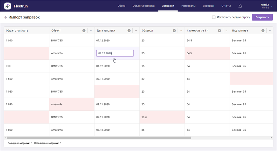 При необходимости отредактируйте данные в таблице. Ячейки с некорректными данными выделяются красным цветом. Заправки с такими ячейками импортировать нельзя. Чтобы изменить данные, нажмите на ячейку и введите в нее новый текст. Для сохранения текста щелкните левой кнопкой мыши вне ячейки.