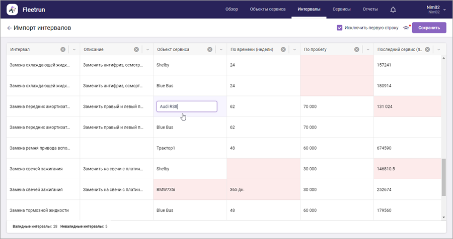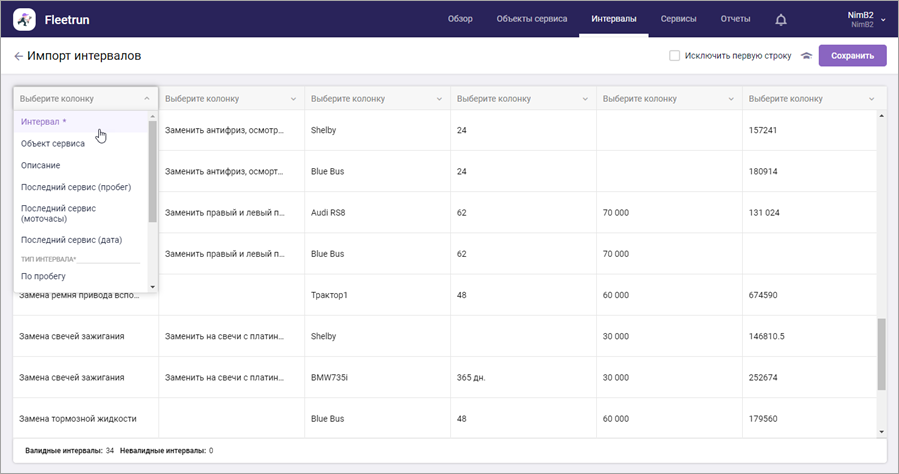 Укажите названия необходимых колонок в таблице с результатами импорта. Для этого в выпадающем списке над каждой колонкой выберите ее имя. В таблице обязательно должна быть колонка Интервал и хотя бы одна колонка из блока Тип интервала (По пробегу, По моточасам, По времени). Чтобы отменить выбор, нажмите на иконку