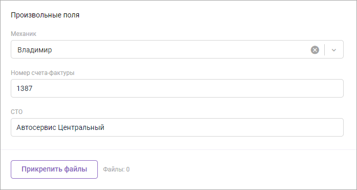 Если в качестве типа объекта сервиса выбран Объект, после описанных выше полей показываются произвольные поля, созданные администратором автопарка на одноименной вкладке страницы Администрирование. Эти поля необязательны для заполнения.