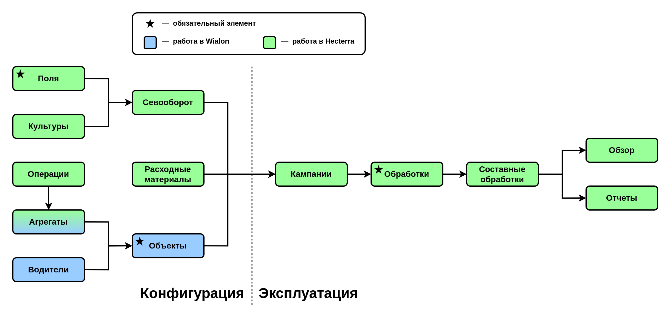 С помощью пунктирной линии на схеме выделены два этапа работы с приложением: конфигурация и эксплуатация. Предполагается, что настройка элементов в левой части схемы осуществляется администратором Wialon и/или агрономом до начала повседневного использования Hecterra.