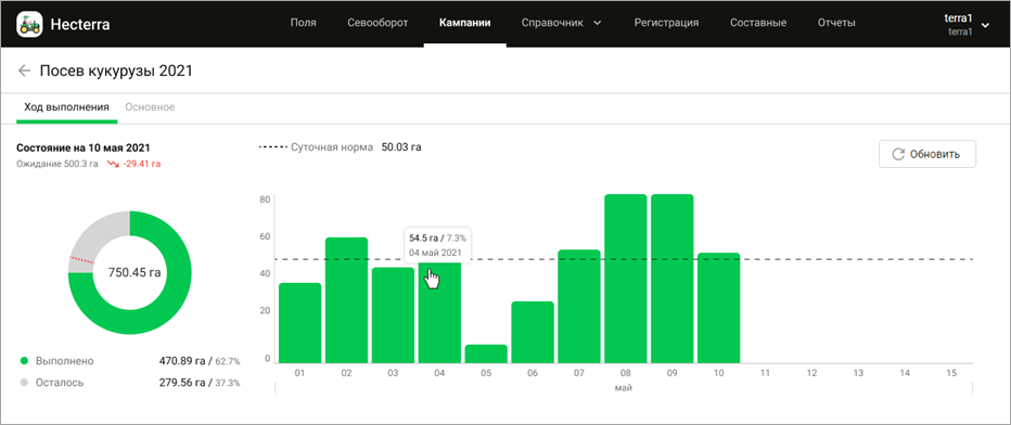 | Строка Ожидание, пунктирная линия на диаграмме | Ожидаемая обработанная площадь на сегодня, которая рассчитывается путем умножения суточной нормы на количество прошедших дней кампании. |