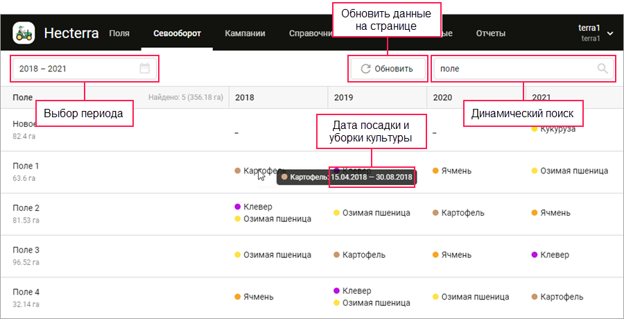 Эта страница представляет собой таблицу, в которой можно увидеть, какие культуры выращиваются или выращивались в разные годы на всех полях. Необходимый период выбирается в календаре. Для таблицы работает динамический поиск по имени и описанию поля.