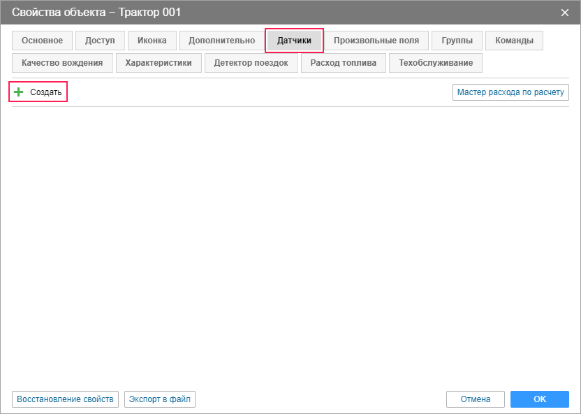 На вкладке Датчики свойств объекта в Wialon нажмите Создать.