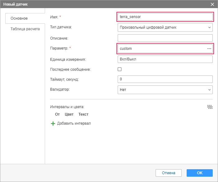 Заполните обязательные поля: имя и параметр датчика. Нажмите ОK.