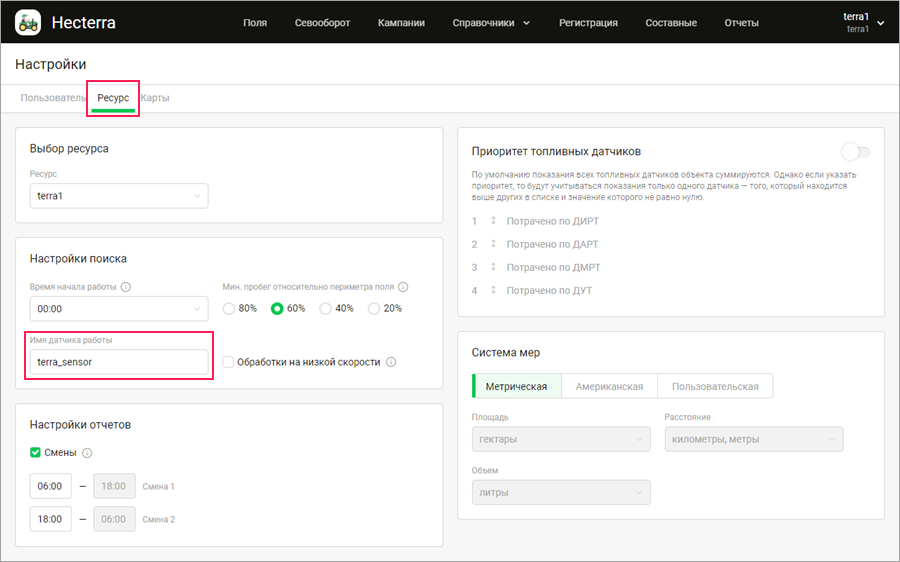 В Hecterra в меню пользователя выберите пункт Настройки. На вкладке Ресурс в поле Имя датчика работы введите имя датчика, созданного в Wialon на предыдущих шагах. Нажмите Сохранить.