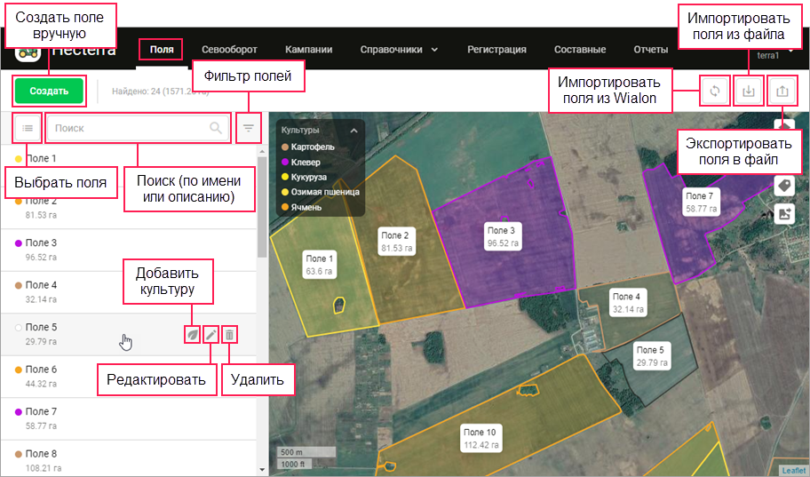 Поля являются одним из ключевых элементов в Hecterra. Для работы с ними выберите одноименный пункт в навигационной панели.