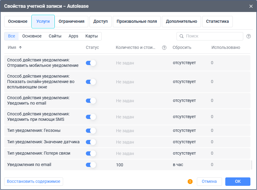 Услуги в этой группе активируют основной функционал LeaseControl, такой как Объекты, Команды, Геозоны и другие. Здесь вы можете включить или отключить услугу, настроить параметр Количество и стоимость и выбрать период сброса.
