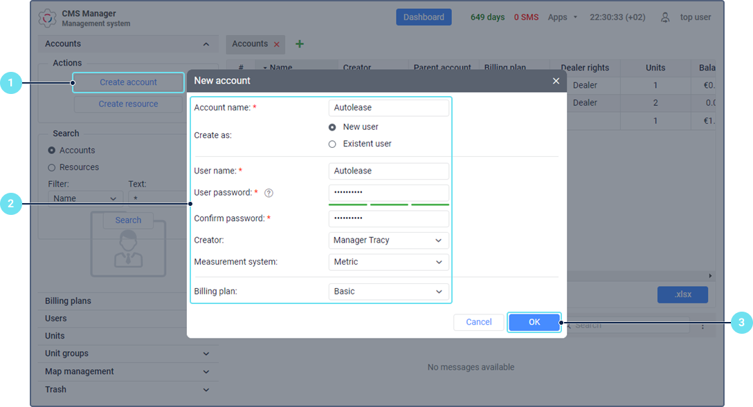 - Нажмите на кнопку Создать учетную запись в разделе Учетные записи системы управления CMS Manager.