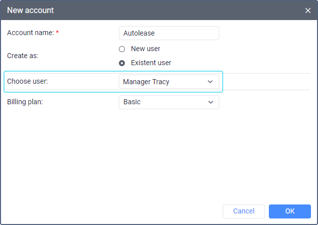 | Создать от имени | В качестве создателя новой учетной записи можно указать нового пользователя или выбрать уже существующего. По умолчанию выбрана опция Создать от имени нового пользователя, которая предполагает заполнение следующих полей: имя пользователя, пароль пользователя, создатель и система мер. Пользователь, указанный в качестве создателя учетной записи, получает на нее Полный доступ. |