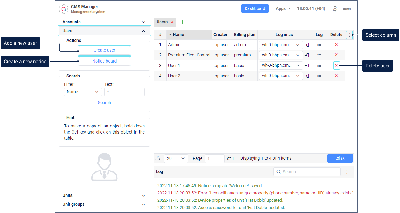 В таблице раздела Пользователи содержатся все доступные пользователи. Здесь можно выполнять следующие действия с ними: создание, копирование, просмотр или редактирование свойств, удаление. Для быстрого поиска пользователей воспользуйтесь динамическим фильтром.