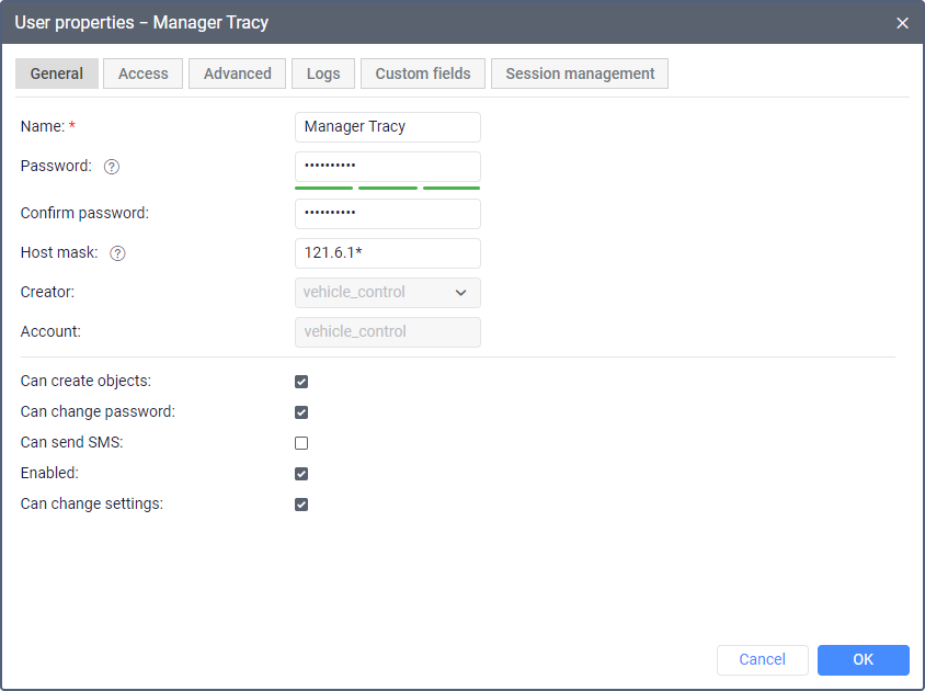 Окно свойств пользователя показывается при создании, редактировании и копировании пользователя. В этом окне вы можете указать различные параметры пользователя, настроить доступ к нему, посмотреть журнал действий, добавить произвольные поля и пр.