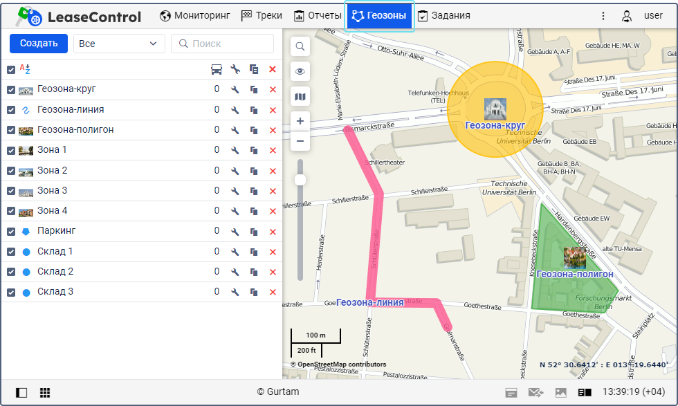 Геозона может иметь форму полигона (например, город или территория завода), линии (например, определенная улица) или круга произвольного радиуса.