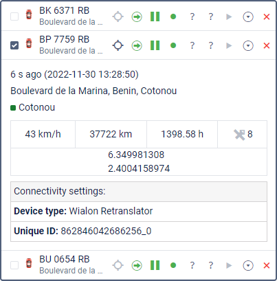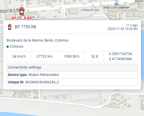 В зависимости от настроек объекта значения во всплывающем окне и расширенной информации могут быть в метрической (километры, метры, километры в час, литры), американской (мили, футы, мили в час, галлоны) или имперской (мили, футы, мили в час, галлоны) системах мер.