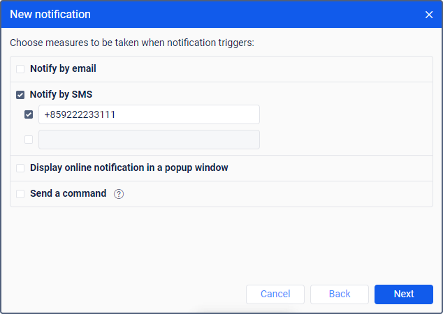 Этот способ действия позволяет настроить отправку уведомлений в виде SMS-сообщений. Он доступен только в том случае, если в свойствах пользователя включена опция Может отправлять SMS. Телефонные номера необходимо указывать в международном формате (например, +375293293294). После каждого ввода автоматически добавляется новое поле.