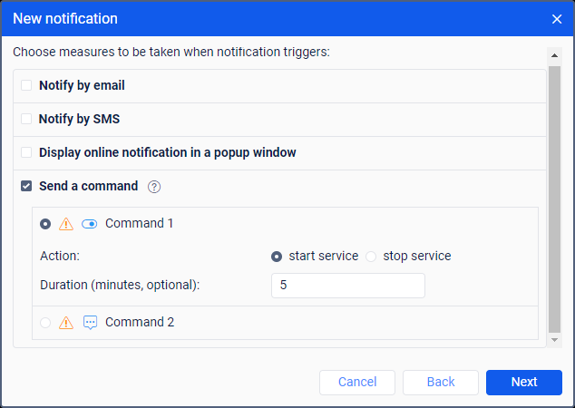 Этот способ действия позволяет отправить определенную команду на объект(ы). В списке содержатся все доступные команды, созданные в свойствах всех выбранных объектов, если на эти объекты есть право доступа Отправка команд. Слева от имени каждой команды могут показываться следующие иконки: