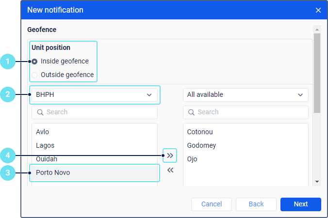 В левом списке выберите геозоны, для которых должно срабатывать уведомление. Для поиска можно воспользоваться динамическим фильтром над списком.