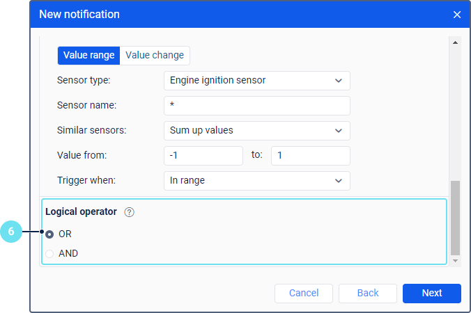 Выберите логический оператор, на основании которого должно срабатывать уведомление, если выбрано несколько геозон. Доступны операторы ИЛИ и И.