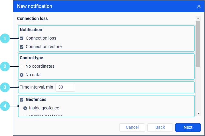 Возможна ситуация, когда отправляются сообщения с данными датчиков, но в них нет данных о местоположении объекта (например, в случае закрытия GPS-антенны).Нет данных Если выбрана эта опция, то потерей связи считается отсутствие любых сообщений от объекта. -