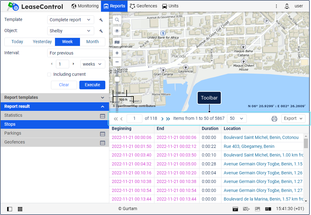 Из таблицы отчета можно перейти к сообщениям и к точкам на карте, соответствующим значениям отчета.