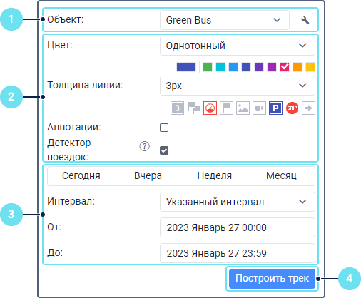 В результате на карте появится линия движения объекта, построенная по заданным вами параметрам, если за указанный период есть сообщения с координатами.