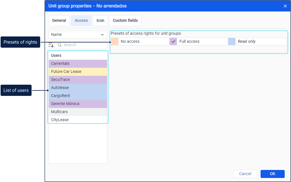 В левой части окна показывается список пользователей, которым вы можете предоставить права доступа на группу. Имена пользователей с назначенными шаблонами прав доступа выделяются цветным фоном.