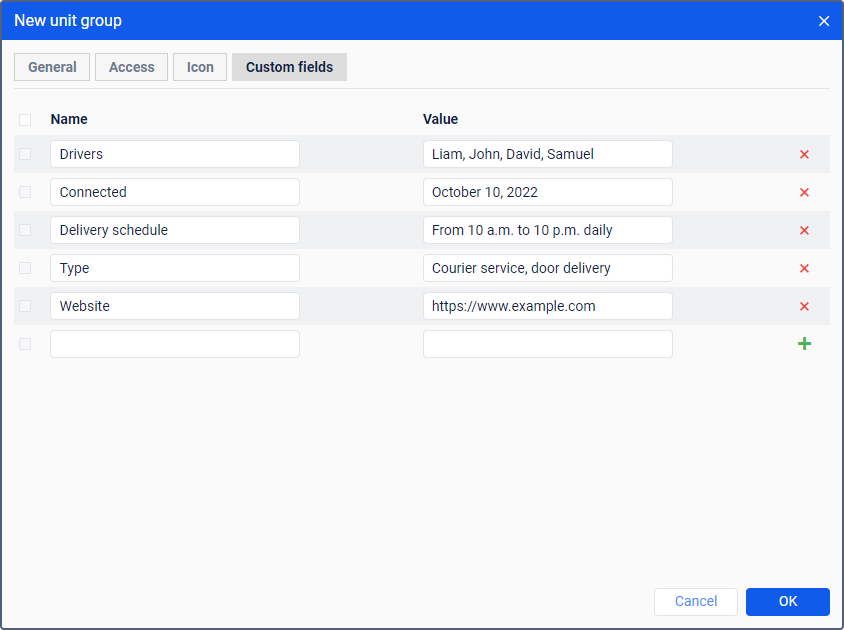 На вкладке можно создать произвольные поля с дополнительной информацией о группе или объектах, добавленных в нее.