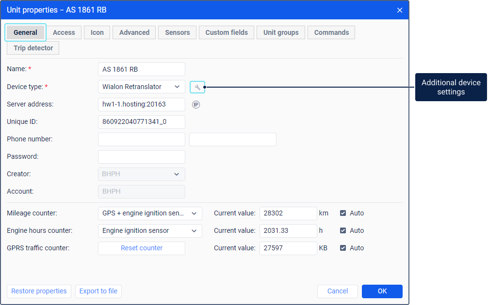 На вкладке Основное также можно увидеть и настроить счетчики, которые могут использоваться для учета пробега и моточасов.