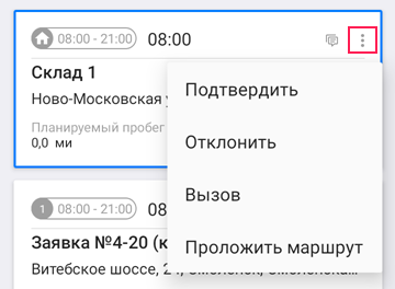 Если в веб-версии настроены требования к выполнению заявки (опции Не подтверждать заявку вне радиуса, Не подтверждать заявку без подписи), то подтверждение невозможно без выполнения этих требований. Опция Не подтверждать заявку вне радиуса не распространяется на склады. Водитель может подтвердить посещение склада независимо от местоположения. |