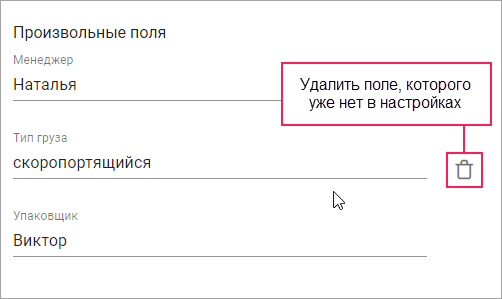 Если вы сохранили произвольное поле в заявке и после этого удалили его в настройках, оно остается в заявке. Если необходимо его удалить, наведите курсор на строку с полем и нажмите на иконку