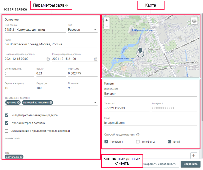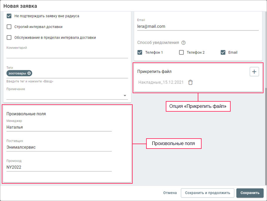 В параметрах заявки указывается основная информация о заявке и доставке. Поля Имя заявки и Адрес обязательны для заполнения.