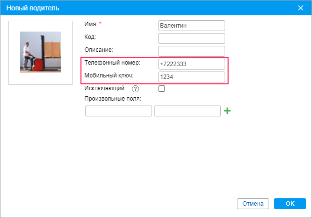 2. В свойствах водителя заполните поля  Телефонный номер  и  Мобильный ключ.